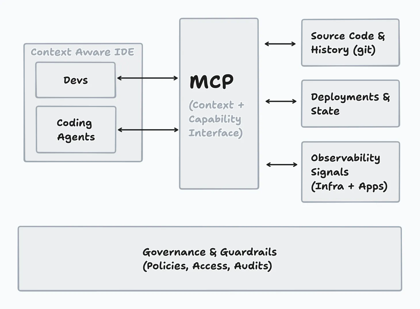 MCP is not an execution platform. It is an interface and context-sharing protocol. It provides a structured way for development tools and models to access code repositories, infrastructure metadata, and observability systems through a consistent interface.